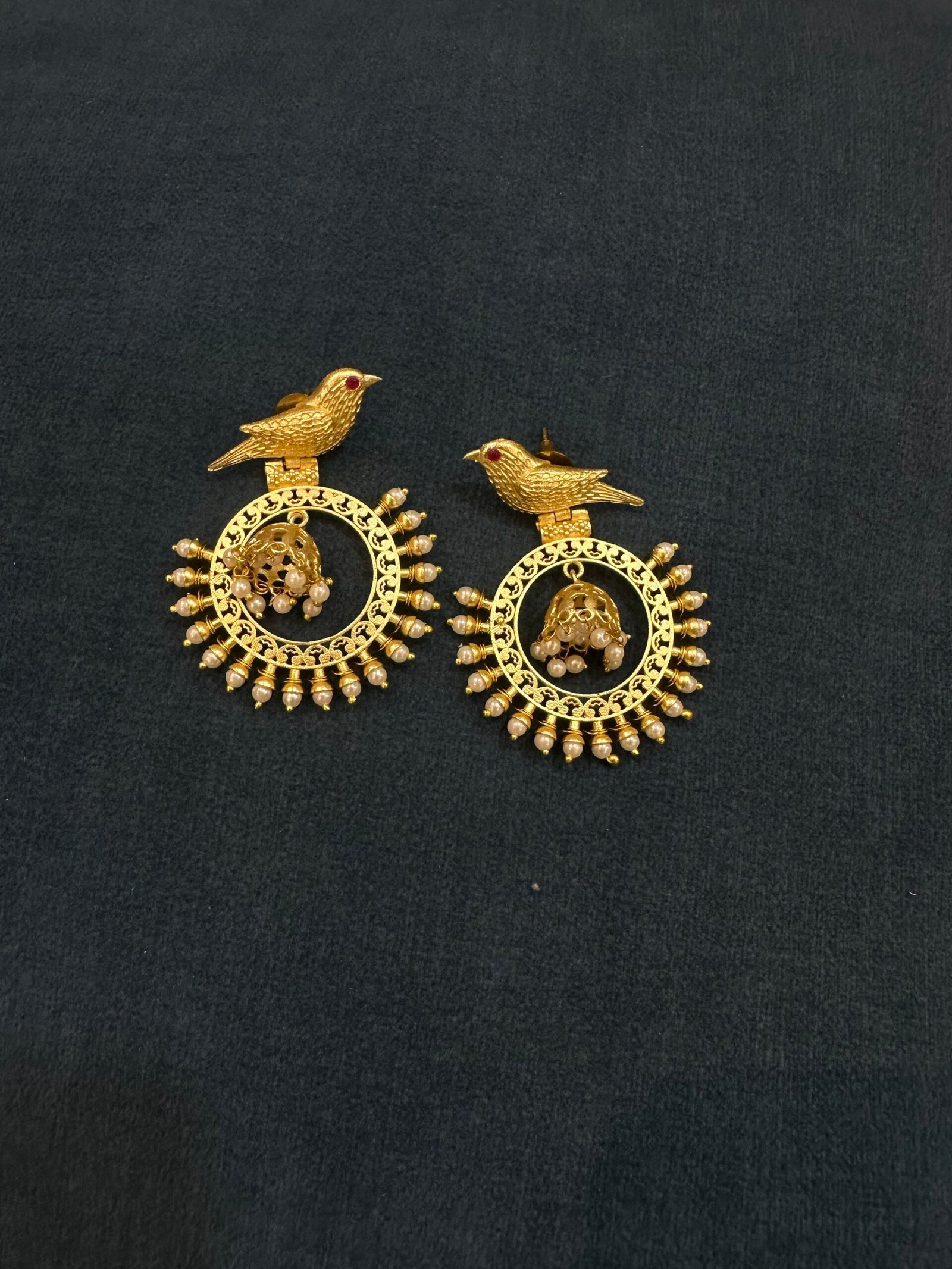 Intricately crafted gold chandbalis with a royal bird motif and delicate pearl detailing.